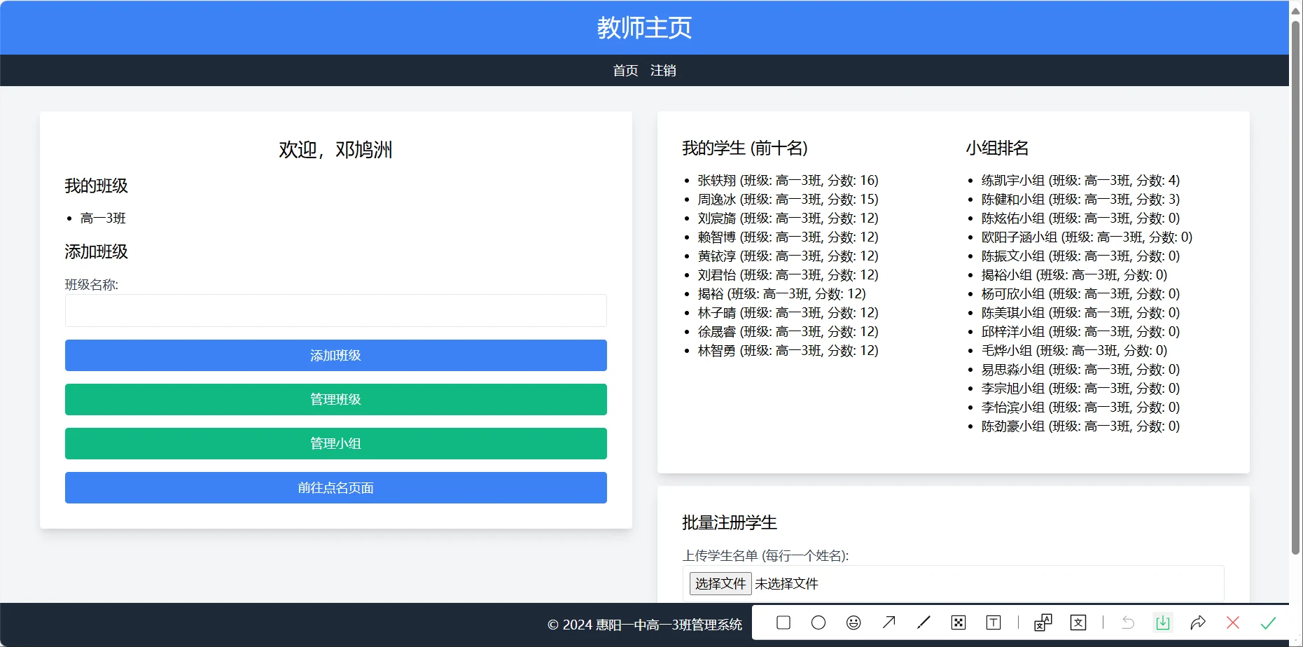 在这里先介绍下功能,大体是一个人脸识别并自动考勤扣分的软件,然后为了实现德育量化分,我们又用PHP开发了一个web端的系统。在识别到人脸后会检测当前时间,若迟到则自动扣分,这套系统非常适合班级内的量化评比以及日常管理。有分组和个人分,并且会自动计算排名和分数。